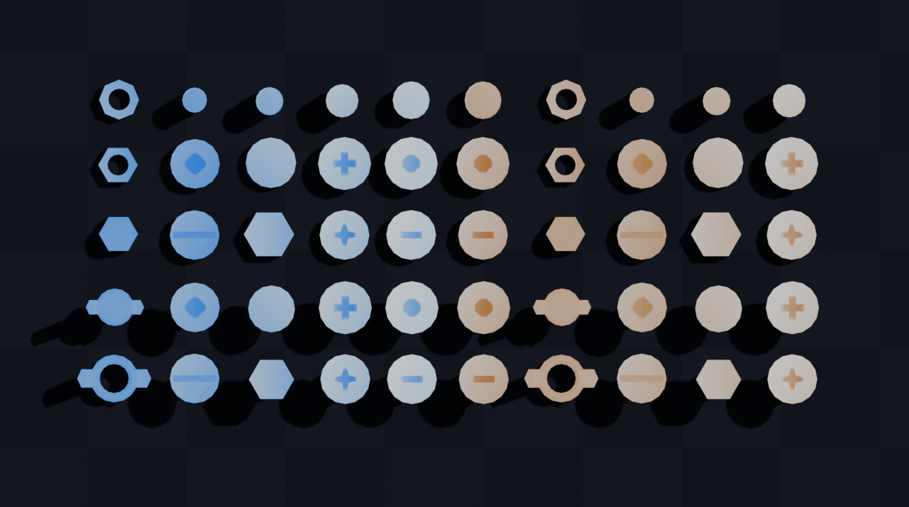 A game-ready pack of stylized fasteners (bolts/screws/etc) built as a modular system! :]